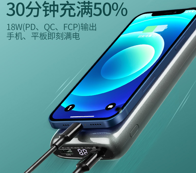 无线充电宝20000毫安是一款支持无线+有线快充的便携充电宝。充电宝支持有线PD18W快充和无线10W充电,有线无线自由切换,真闪充不等待;2万毫安大容量持续持久,智能数字显示,随时知晓充电宝电量,出行充电更安心。