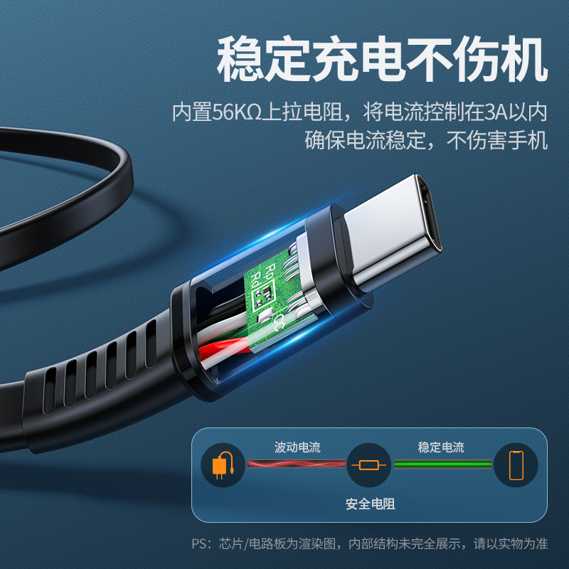 type-c快充线内置56KΩ上拉电阻,将电流控制在3A以内,确保电流安全平稳的进入手机,不伤害设备;