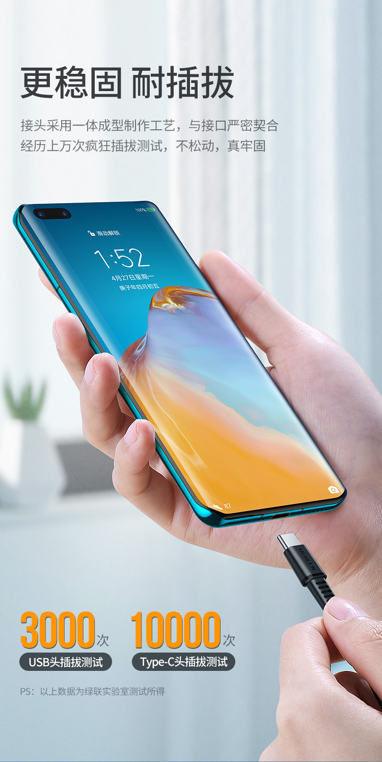 Type-C快充数据线支持华为FCP/小米QC快充技术,充电更快;