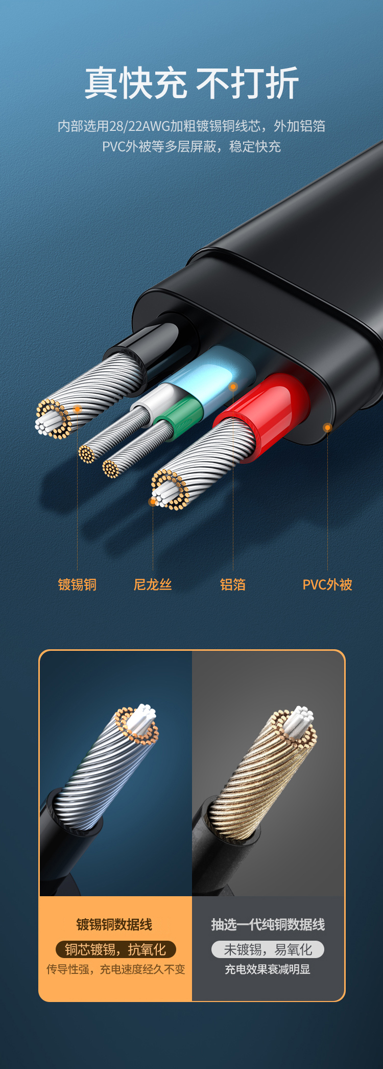 type-c快充数据线采用加厚PVC紧密包裹,柔软高弹易收纳;
